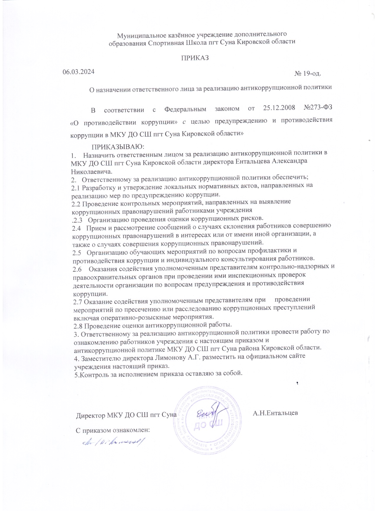 Приказ о назначении ответственного лица за реализацию антикоррупционной политики
